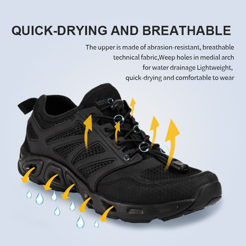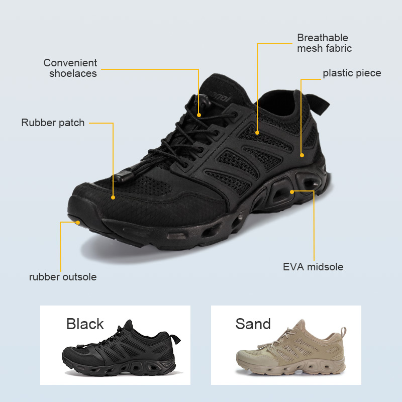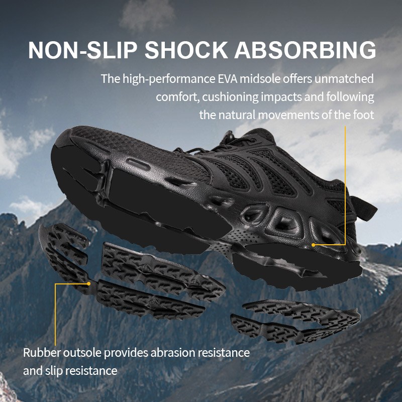 EVA Shock Absorbing Trekking Shoes ကို စိုစွတ်သော သို့မဟုတ် ခြောက်သွေ့သောလမ်းအတွက် တည်ဆောက်ထားသည်။ အခြောက်ခံပစ္စည်းများနှင့် ရေနုတ်မြောင်းများတွင် အမြန်အခြောက်ခံသော ဆိပ်ကမ်းများဖြင့် စမ်းချောင်းမှ တောင်ထိပ်သို့သွားသည့်အခါ ရေမြန်မြန်ကျသည်။ ရာဘာခြေဖနောင့်ဖာထေးခြင်းသည် တည်ငြိမ်မှုရှိစေပြီး EVA midsole သည် ပျော့ပျောင်းပြီး တုန်လှုပ်ခြင်းကို သက်သာစေသော ခြေဖဝါးအောက်ကို ပေးစွမ်းသည်။ ပြီးတော့ အကြမ်းခံတဲ့ ရော်ဘာ အပြင်ဖိနပ်လား။ ကျောက်၊ ရွှံ့၊ ကျောက်စရစ်ခဲ မှန်သမျှကို ဆုပ်ကိုင်နိုင်ရန် တည်ဆောက်ထားသည်။ ၎င်းသည် ကုန်းရေနှစ်သွယ်၊ သွက်လက်ပြီး သင်နှင့်အတူ ရွေ့လျားရန် တည်ဆောက်ထားသည်။