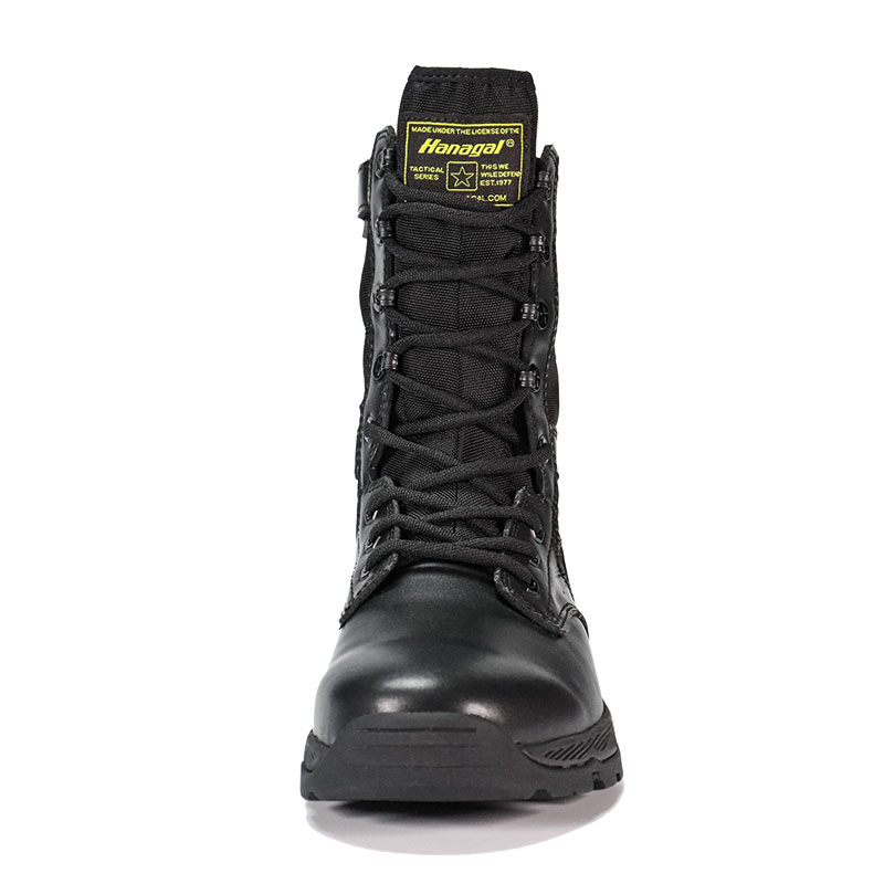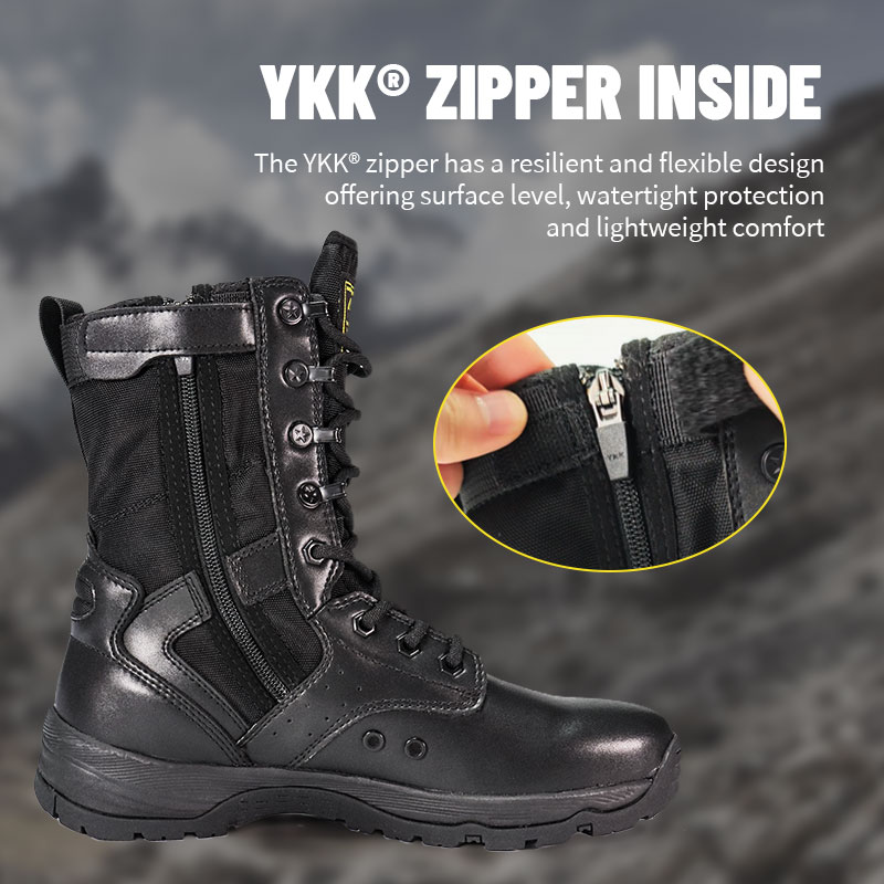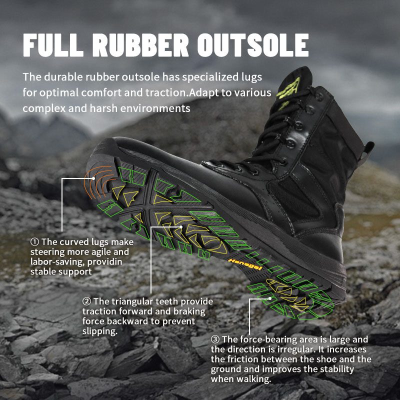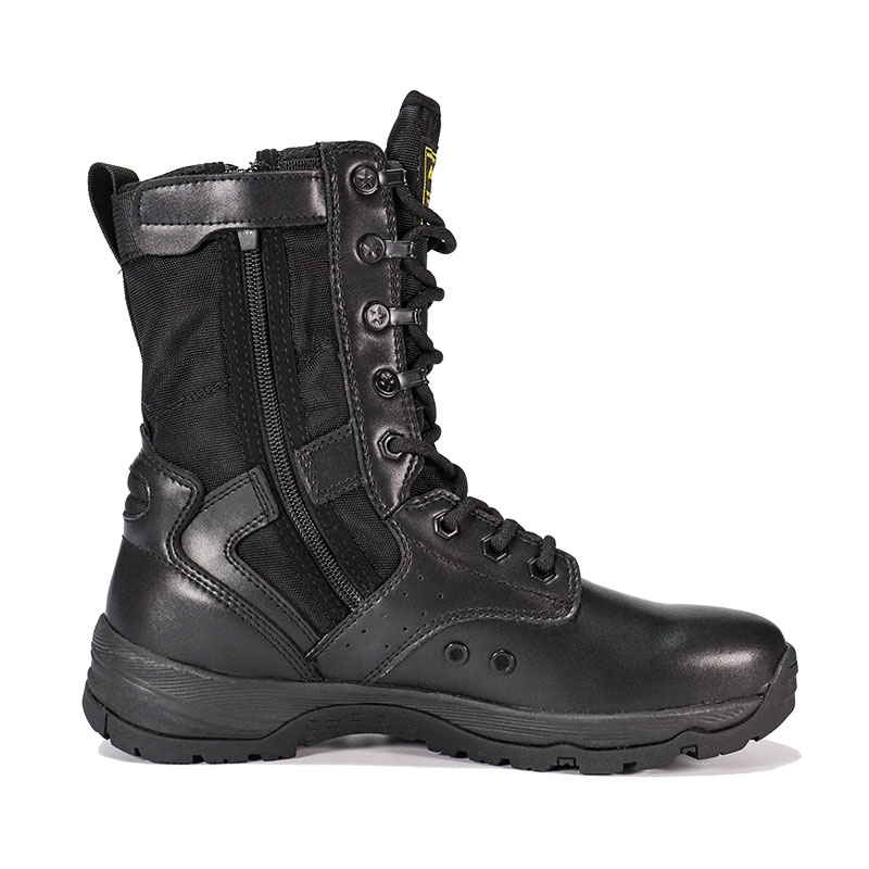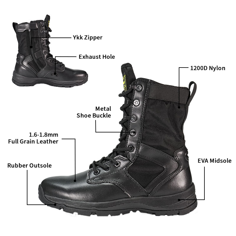 စစ်မှုထမ်းများနှင့် ပြင်ပဝါသနာရှင်များအတွက် တည်ဆောက်ထားသည့် Full Rubber Outsole Police Boots သည် ကြမ်းတမ်းသောမြေပြင်ပေါ်တွင် ပြင်းထန်သောတည်ငြိမ်မှုနှင့်အတူ သက်တောင့်သက်သာရှိပြီး ပတ်ချာလည်ပတ်ကာ အံဝင်ခွင်ကျဖြစ်စေသည်။ ရှည်လျားသော လျှာသည် အညစ်အကြေးများကို ဖယ်ထုတ်ပြီး အလယ်ဗဟိုတွင် ရှိနေစေပြီး တာရှည်ခံ အင်္ကျီနှင့် နိုင်လွန်အပေါ်ပိုင်းသည် ခက်ခဲသော အခြေအနေအထိ ရပ်တည်နိုင်သည်။ YKK ဇစ်သည် အဖွင့်အပိတ်လုပ်ရန် လွယ်ကူစေသည်- ထို့ကြောင့် သင်သည် ရှေ့ဆက်လုပ်ဆောင်ရမည့်မစ်ရှင်ကို အာရုံစိုက်နေနိုင်သည်။